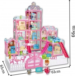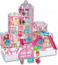 - Összeépíthető babaház, babafigura, kutyusfigura, bútorok és kiegészítők, kert kerítéssel és kapuval, lépcső, csúszda