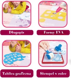 Fedezze fel a varázslatos, rendetlenség nélküli rajzolást a WOOPIE vizes alátéttel. A gyermek csak vízzel rajzol a tölthető filcekkel, a képek rövid idő után maguktól eltűnnek, és az alátét máris készen áll az újabb alkotásra. A nagy 98 × 78 cm méret hercegnős motívummal minden kis művésznőt elbűvöl, miközben fejleszti a kreativitást, a finommotorikát és a kéz–szem koordinációt már 12 hónapos kortól.