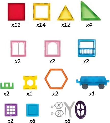 A készlet négyzeteket, háromszögeket és speciális elemeket tartalmaz élénk színekben. A gyerekek 2D mintákat és 3D építményeket is készíthetnek, fejlesztve térbeli képzelőerejüket.