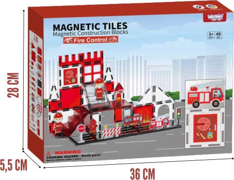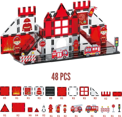 - 48 mágneses elem, köztük panelek és tűzoltó témájú elemek
