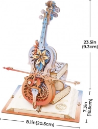 A Varázslatos cselló egy stílusos fa mechanikus kirakó és zenedoboz egyben. Összeszerelés után a vonó kecsesen mozog, a fogaskerekek halkan életre kelnek, a tetején pedig egy elegáns liliom forog. Az egész egy nyitott könyveket idéző talapzaton áll – a fantázia és a művészet szimbóluma –, amely különleges dekorációvá teszi a nappaliba, dolgozószobába vagy diákszobába.