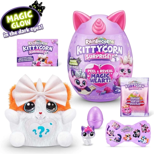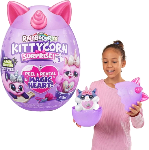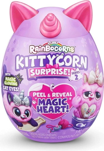 Merülj el a meglepetésekben a RAINBOCORNS KITTYCORN SURPRISE játékkal. A lila tojásban puha plüss cica unikornisszarvval, levehető szívalakú medállal és véletlenszerű kiegészítőkkel vár, amelyek támogatják a fantáziát és az alkotó játékot.