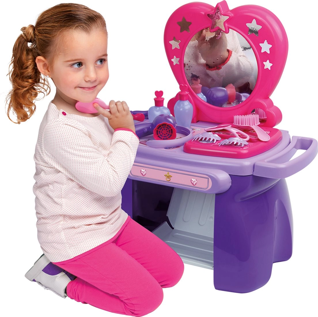 Az attraktív rózsaszín-lila fésülködőasztal szívecskés tükörrel és csillagokkal elbűvöl minden kis hercegnőt, és hosszú órákra hív kreatív játékra.