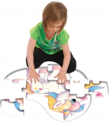 Ez a körvonalas, unikornis alakú puzzle minden meserajongó gyermeket elbűvöl. Az összeállított kép körülbelül 53 × 55 cm, így jól látható, áttekinthető, és kiválóan rakható a padlón. A nagyobb darabok a kisebb kezek számára is kényelmesen foghatók.