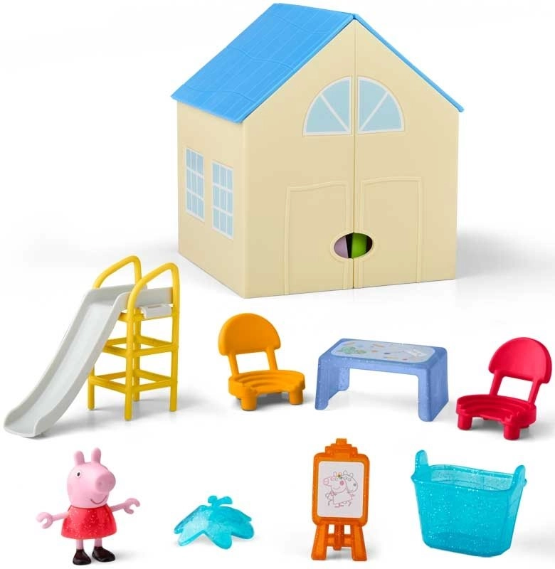 A szett része egy 7,5 cm magas mozgatható Peppa figura, amely le tud ülni a székekre, maszkot viselhet, és csúszdázhat. A praktikus záródásnak köszönhetően játék után minden elem belül elhelyezhető, így semmi sem vész el.