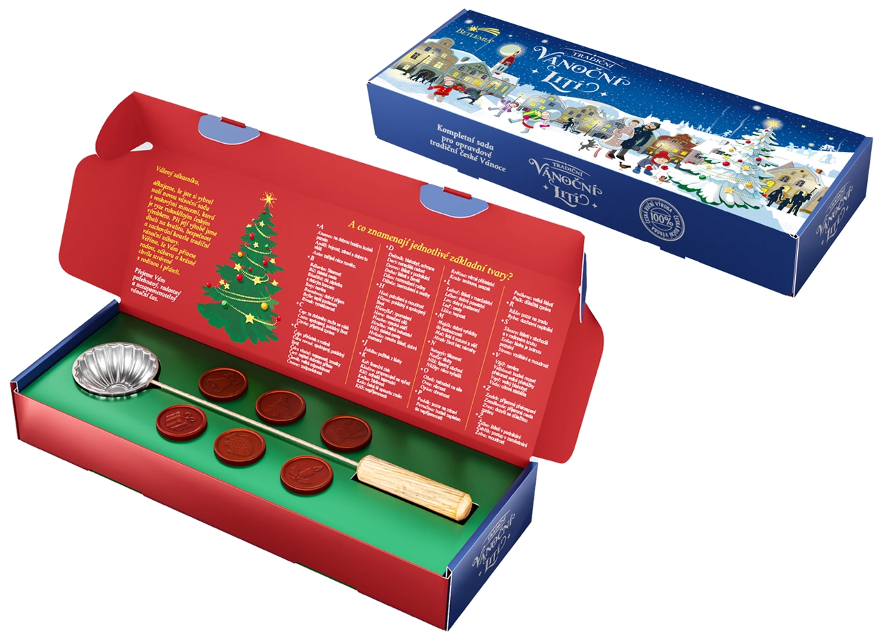 Hagyományos cseh készlet a karácsonyi viaszöntéshez, amely szórakoztató jövendölést kínál az egész családnak. Tartalmaz 6 viaszérmét és egy praktikus öntőkanalat. Cseh termék, amely a cseh hagyományokra épít, és ünnepi hangulatot varázsol.