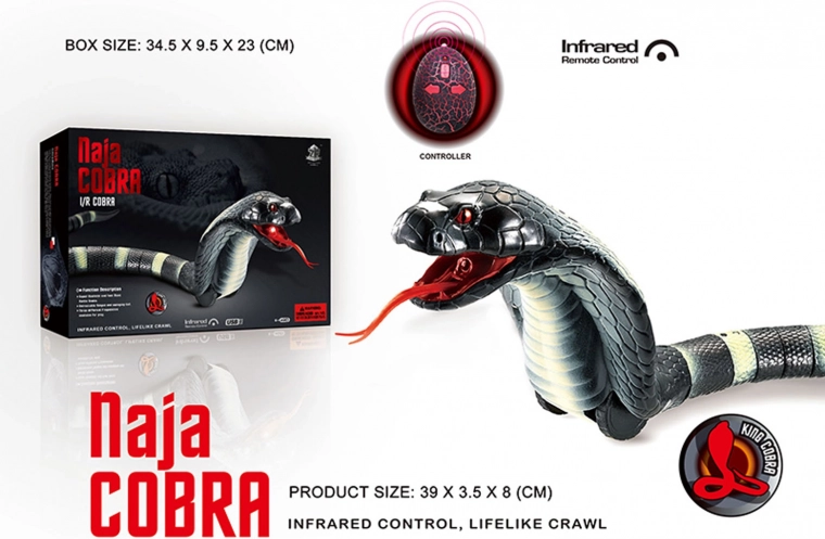 Élethű RC kobra 6 éves kortól, természetes mozgással és effektekkel. Három irányban mozog (előre, jobbra, balra), kígyószerűen kúszik, nyelvet ölt, és világító szája van. A 21 szegmensből álló farok egyenletes és gyors mozgást biztosít. Vezérlés 2,4 GHz frekvencián tojás alakú távirányítóval. A 3,7 V-os újratölthető akkumulátor a csomag része, akárcsak a távirányító elemei.