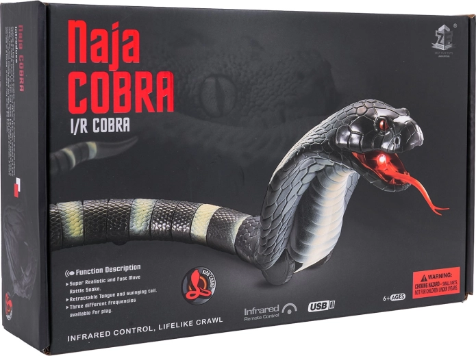 Szórakoztató és valósághű RC kobra 6 éves kortól izgalmas játékot kínál igazán élethű kúszással, mozgó nyelvvel és LED megvilágítással a szájban. A 2,4 GHz-es irányításnak és a 21 farokszegmensnek köszönhetően a kígyó fürgén vált irányt, és hűen utánozza egy valódi kobra mozgását. A tölthető akkumulátor mellékelve, akárcsak a ergonomikus, tojás alakú vezérlő.