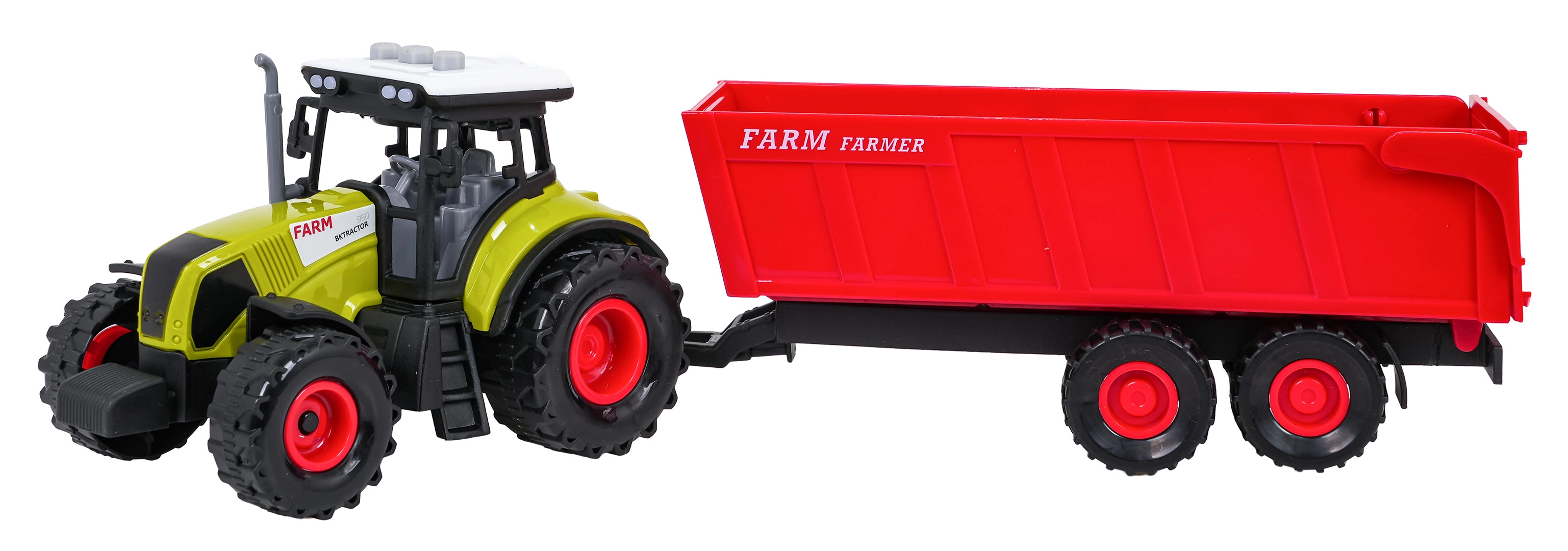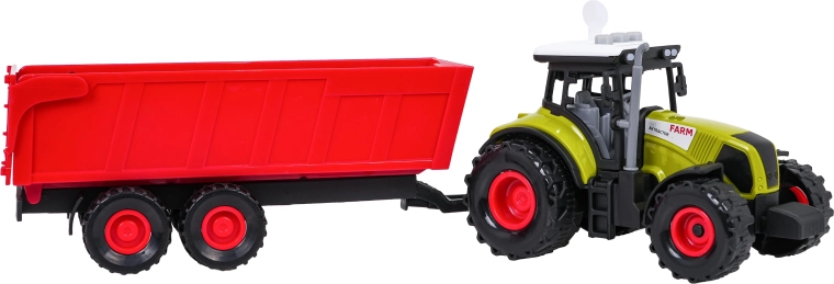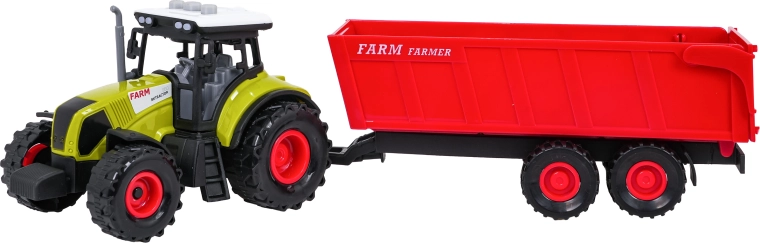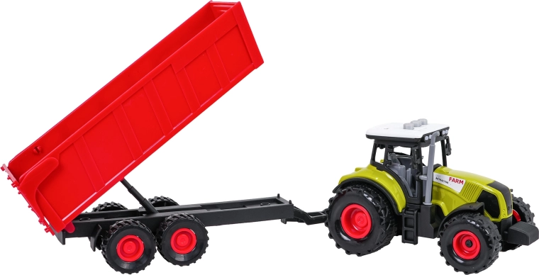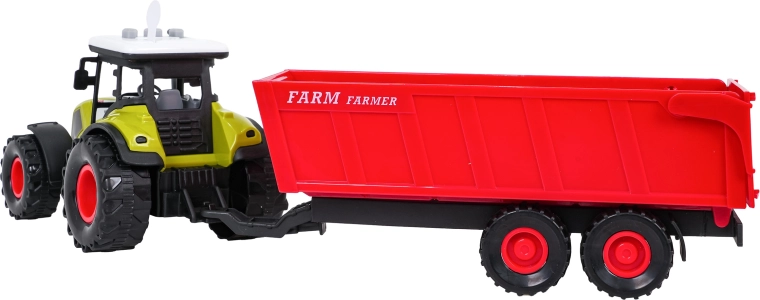 A traktor lejátsza a menet-, tolatási és motorhangokat, működő dudával és villogó fényekkel. A pótkocsi könnyen lecsatlakoztatható és billenthető a valósághű játékért. Az elemek 3× AG13 a csomagban vannak.