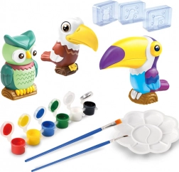 Fedezd fel a szórakoztató kreatív készletet gyerekeknek, amellyel könnyedén elkészíthetitek és feldíszíthetitek saját 3D figuráitokat egzotikus madarakból. A csomag tartalmaz formákat, gipszet, festékeket, ecseteket és palettát – csak vizet kell hozzáadni, és kezdődhet az alkotás. Ez a tevékenység fejleszti a finommotorikát, a kreativitást és a türelmet, az eredmény pedig színes baglyok, tukán és további trópusi madarak gyönyörű szobadíszként.