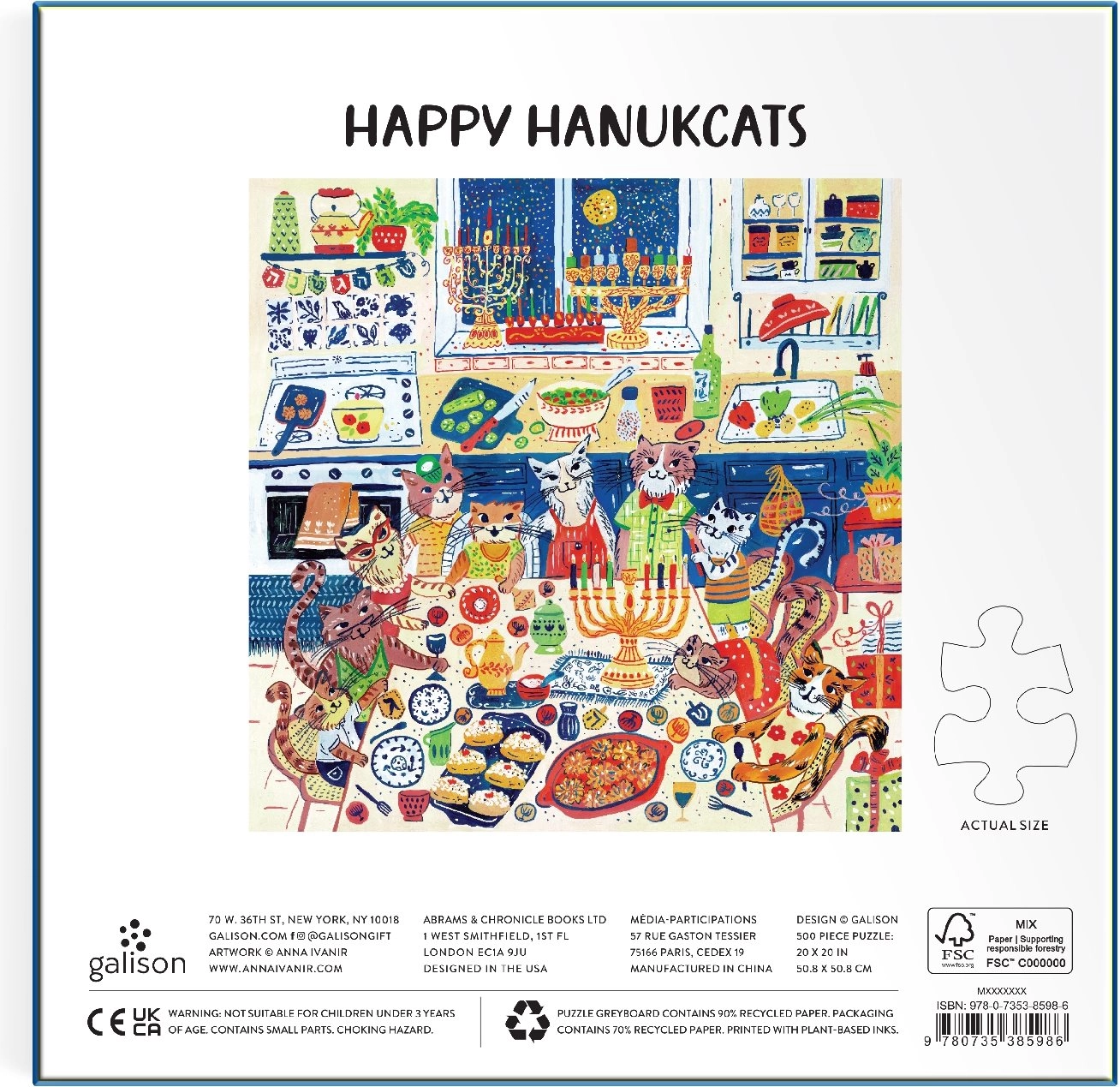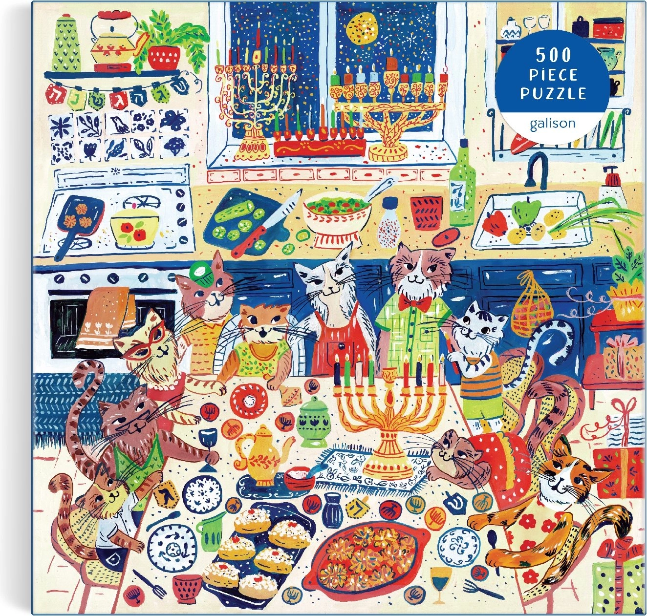 A Happy Hanukcats négyzet alakú puzzle játékos illusztrációval, cicákkal és ünnepi hanukai díszítéssel örvendeztet meg. Az 51 × 51 cm-es formátum és az 500 precízen vágott darab közepes kihívást kínál, amely gyerekeknek és felnőtteknek egyaránt örömet szerez.