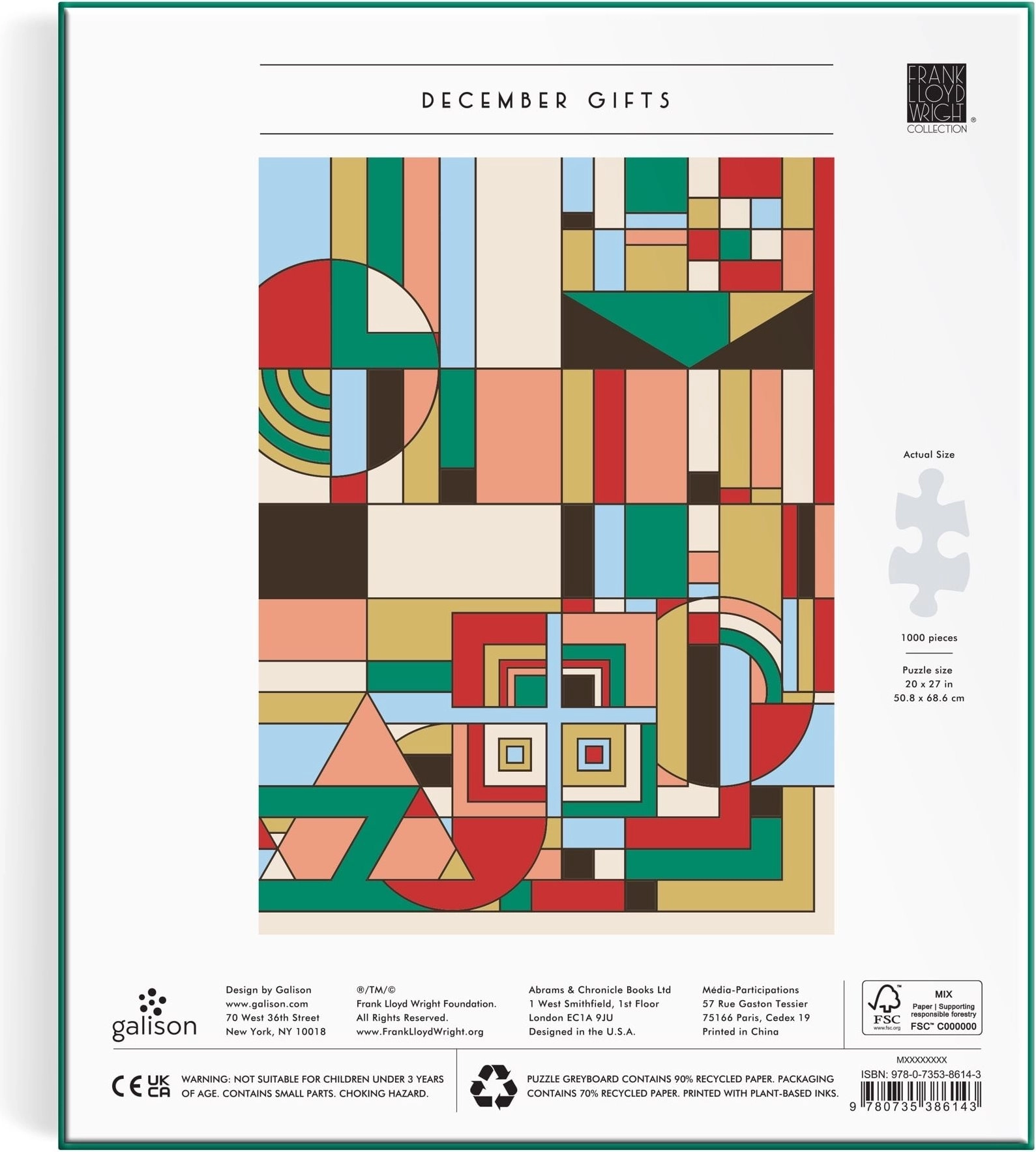 A Galison fémes puzzle a FRANK LLOYD WRIGHT – Decemberi ajándékok motívummal prémium kirakóélményt nyújt. A speciális fémes felület különböző szögekből veri vissza a fényt, így az egyes részek aranynak és ezüstnek hatnak. Az eredmény egy lenyűgöző kép, amely bármely enteriőrben kitűnik.