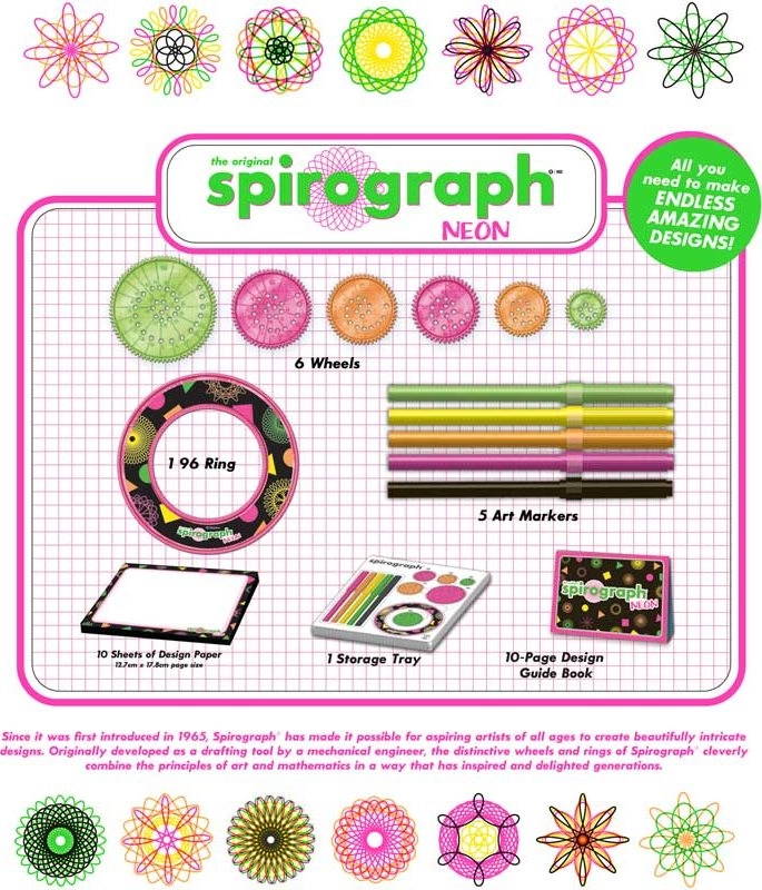 A Spirográf Neon készlettel a gyerekek könnyedén varázsolnak precíz geometrikus mintákat, spirálokat és mandalákat, amelyeket ezután ki is színezhetnek. A készlet célja, hogy játékos formában fejlessze a kreativitást, a kombinációs készséget és a finommotorikát.