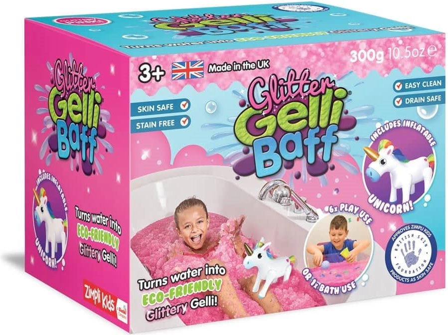 A Glitter Gelli Baff szenzoros szórakozást nyújt a kádban és azon kívül is. Néhány perc alatt a víz sűrű, rózsaszín, csillogó zselévé alakul, amely nem mérgező, káros vegyi anyagoktól mentes és dermatológiailag kíméletes. A játék végeztével add hozzá a mellékelt feloldót, és a zselé visszaalakul vízzé, amely biztonságosan leereszthető.