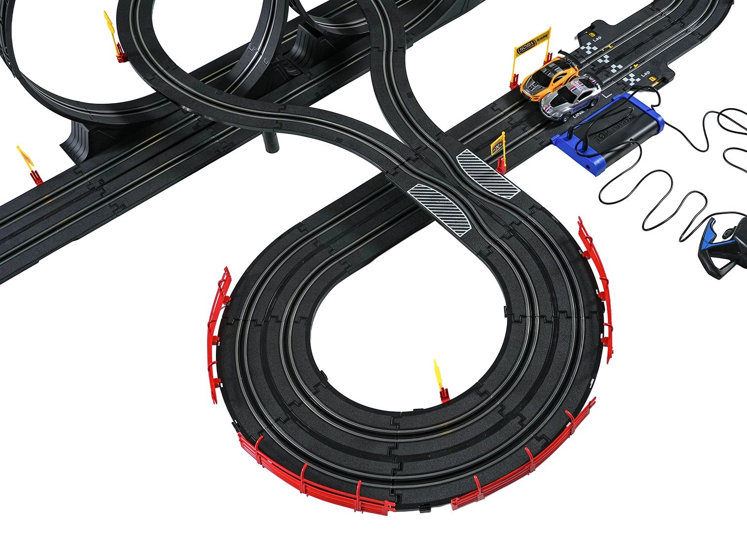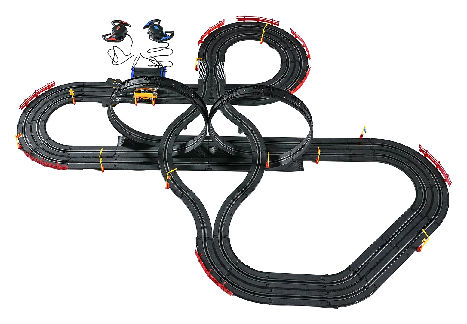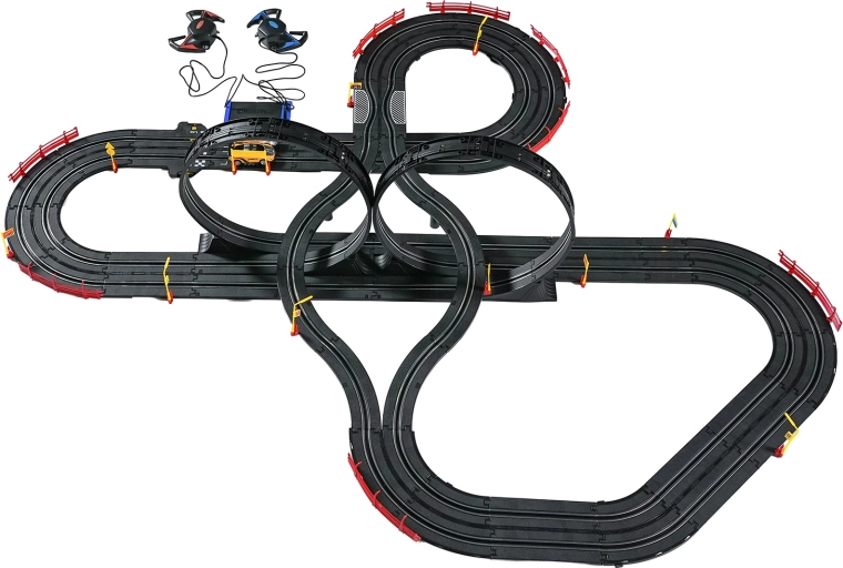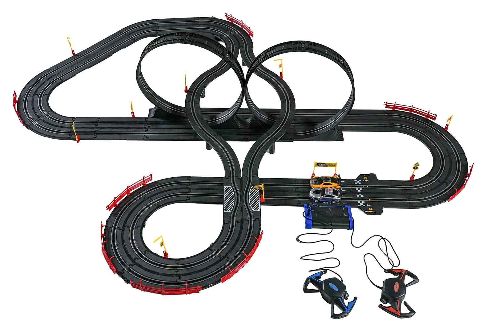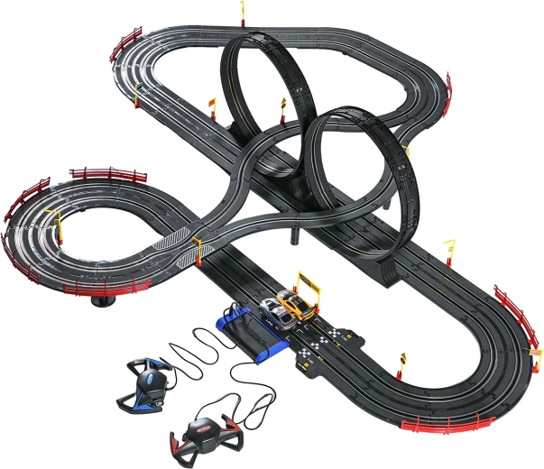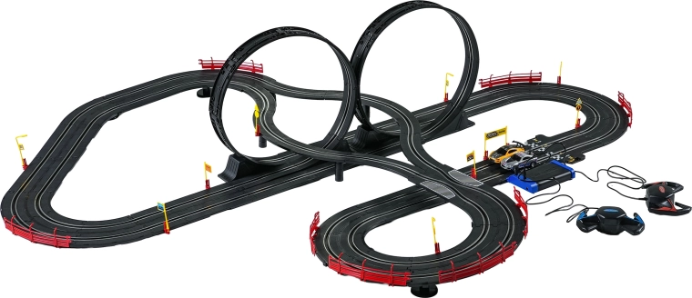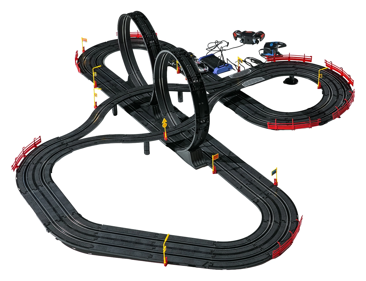Óriási elektromos versenypálya két játékos számára, akár 790 cm hosszúsággal, dupla loopokkal, éles kanyarokkal és hosszú egyenesekkel az izgalmas párharcokhoz. A csomagban 2 versenyautó fényhatásokkal és 2 kormány alakú vezérlő található. A pálya 12 V-os adapterrel (tartozék) vagy elemmel is működtethető, így bárhol és bármikor versenyezhetsz.