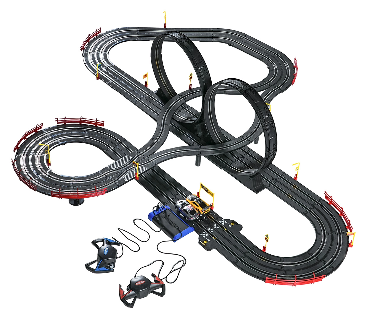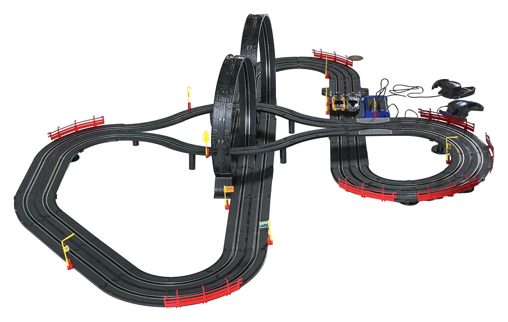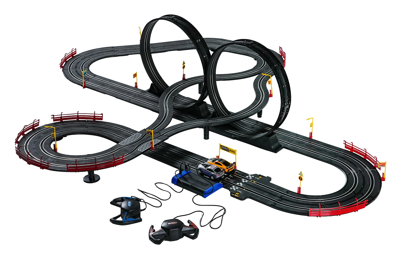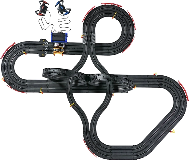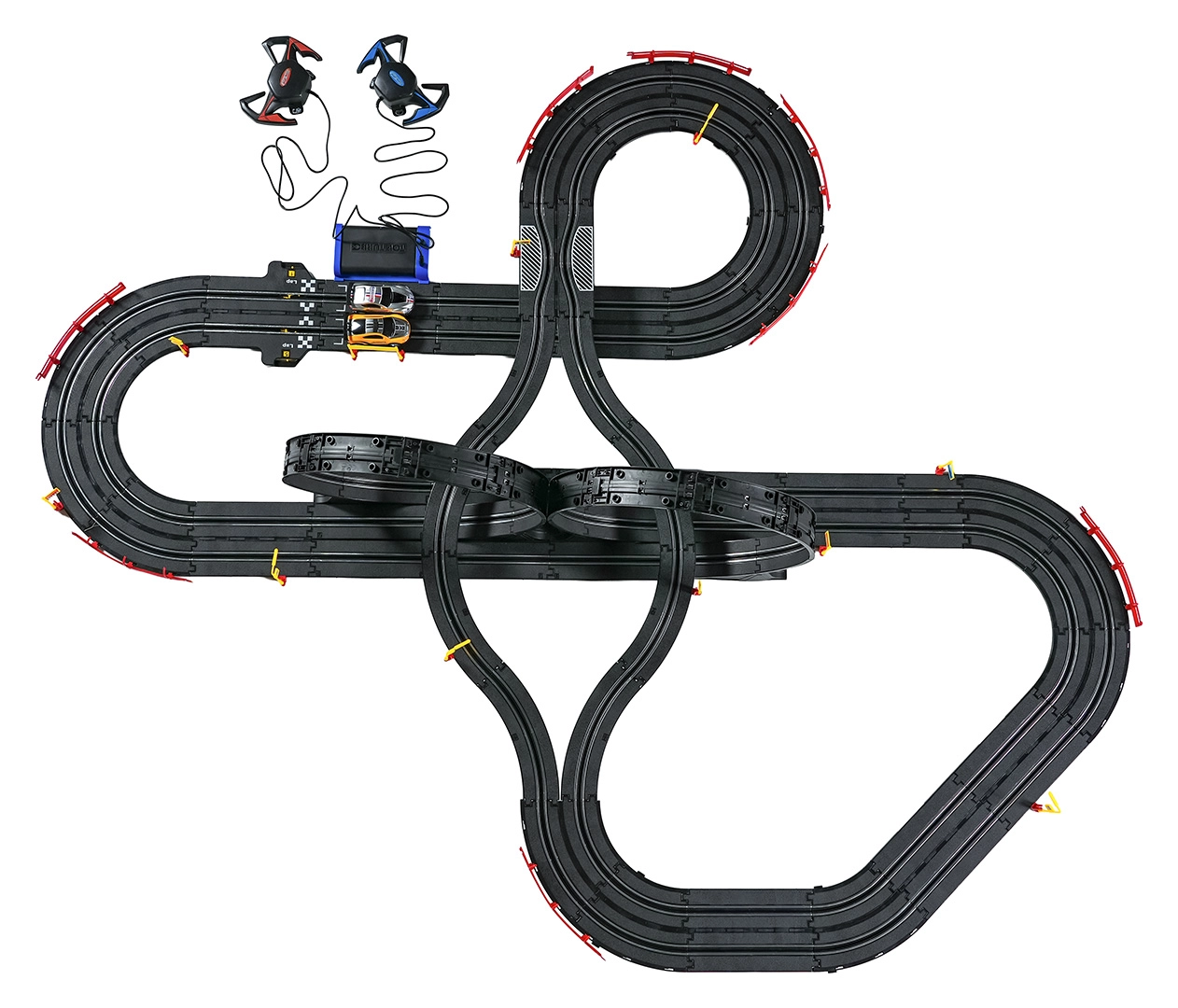 Óriási elektromos versenypálya két játékos számára, akár 790 cm hosszúsággal, dupla loopokkal, éles kanyarokkal és hosszú egyenesekkel az izgalmas párharcokhoz. A csomagban 2 versenyautó fényhatásokkal és 2 kormány alakú vezérlő található. A pálya 12 V-os adapterrel (tartozék) vagy elemmel is működtethető, így bárhol és bármikor versenyezhetsz.