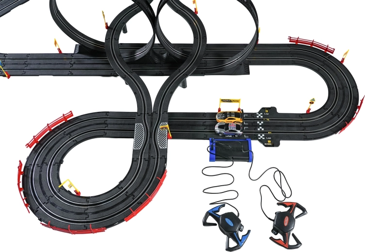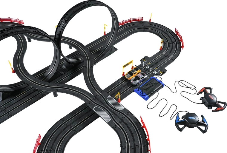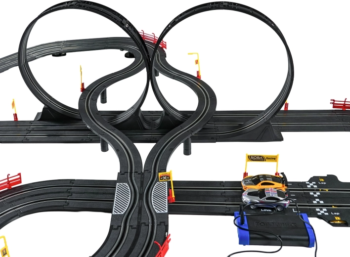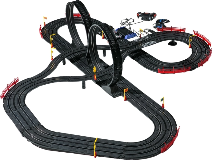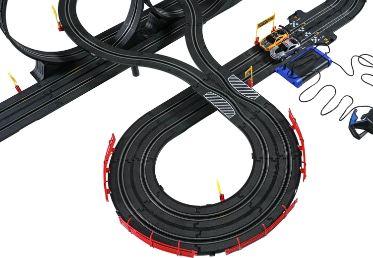 A moduláris elemek biztonsági korlátokkal a leggyorsabb szakaszokon is stabil futást biztosítanak. A két vezérlő a bázisba csatlakoztatható vagy elemmel működtethető, így szabadon versenyezhetsz a saját szabályaid szerint. A hosszú pálya teret ad az előzéseknek, a taktikus vezetésnek és a drámai befutóknak.