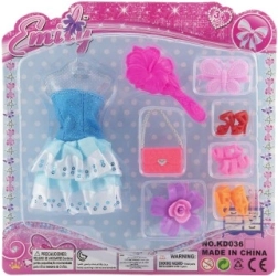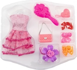 - 1× ruha, 3× pár cipő, 1× kézitáska, 1× hajcsat, 1× fésű, 1× hajgumi virággal