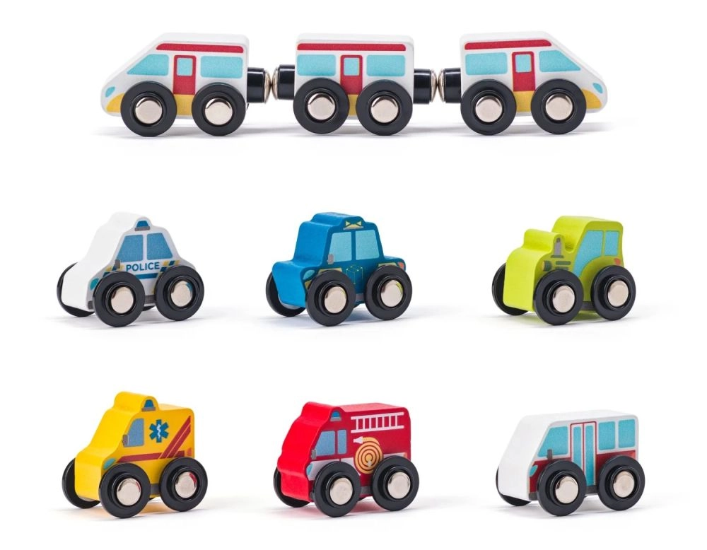 Mentőautó, tűzoltóautó, autóbusz, traktor és mások simán gurulnak az utakon. A háromkocsis vonat mágnesekkel kapcsolódik a könnyű húzáshoz és toláshoz.