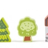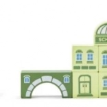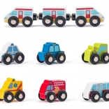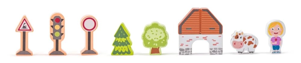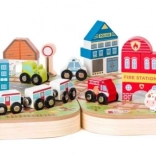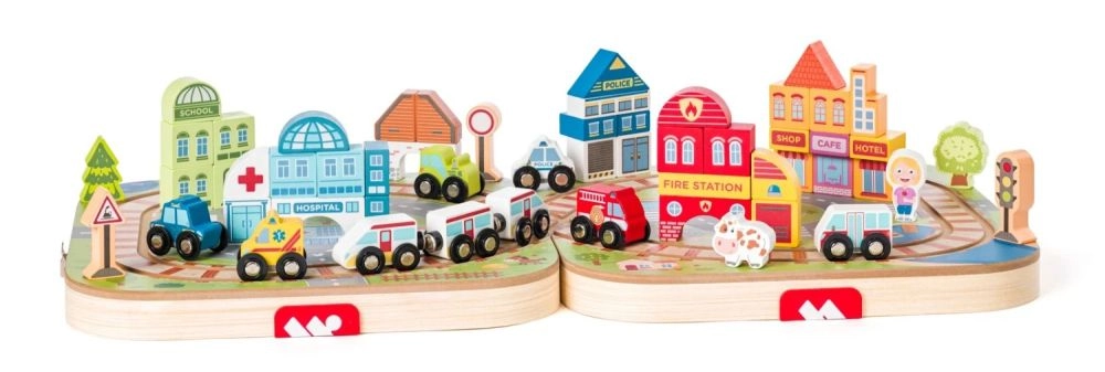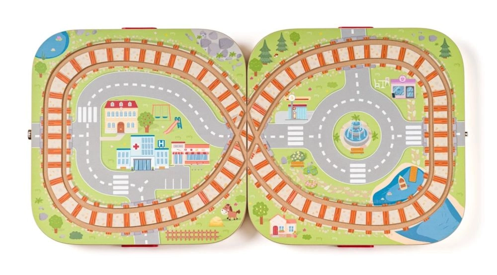 Ez a fa városi készlet bőröndben ideális a kis felfedezőknek. Kinyitás után komplett városi jeleneteket kap kórházzal, tűzoltósággal, iskolával és rendőrséggel, utakkal, közlekedési táblákkal, fákkal és állatokkal. A készlet része továbbá a kerekes fa járműpark – mentőautó, tűzoltóautó, rendőrautó, autóbusz és traktor – valamint a háromkocsis, mágnesesen kapcsolódó vonat.