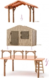 - Teljes szafari állomás – cölöpökre épült ház korláttal, létra, karámok, kézikocsi és praktikus eszközök.