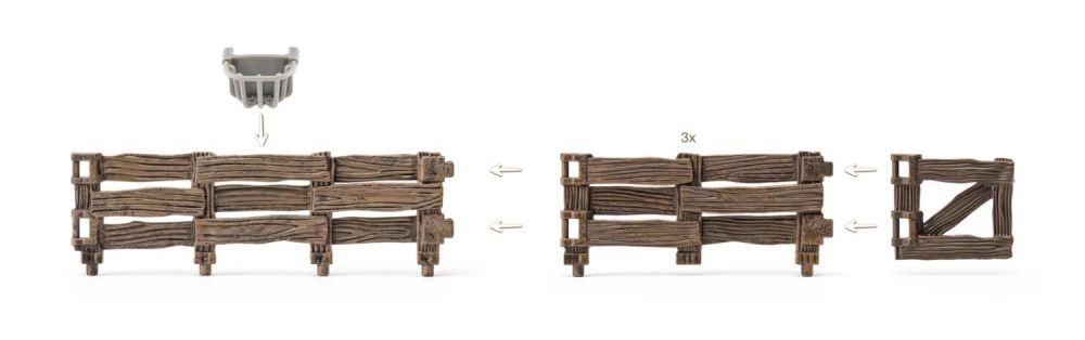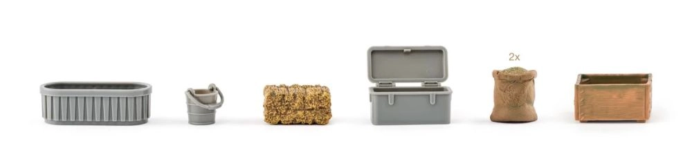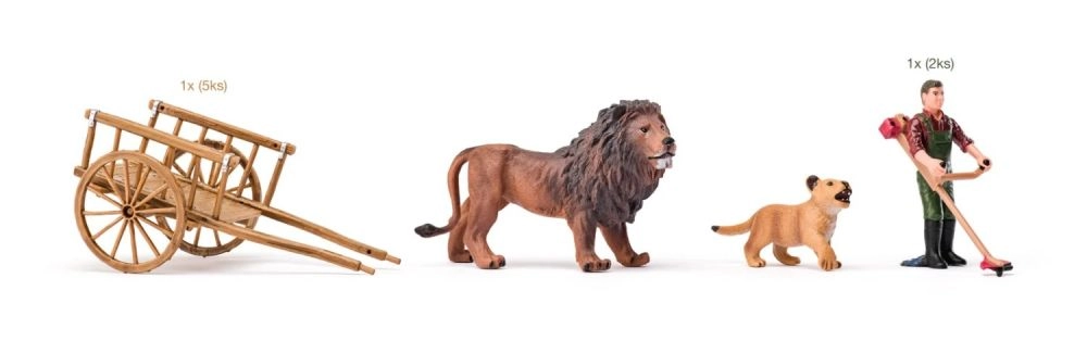 - Emelt faház korláttal és létrával, karámok, kézikocsi, mini szerszámok, emberfigura, állatfigurák (pl. elefánt, elefántkölyök, zsiráf, zebra, zebracsikó, oroszlán, krokodil, víziló, antilop, varacskosdisznó, szurikáta, madarak stb.)