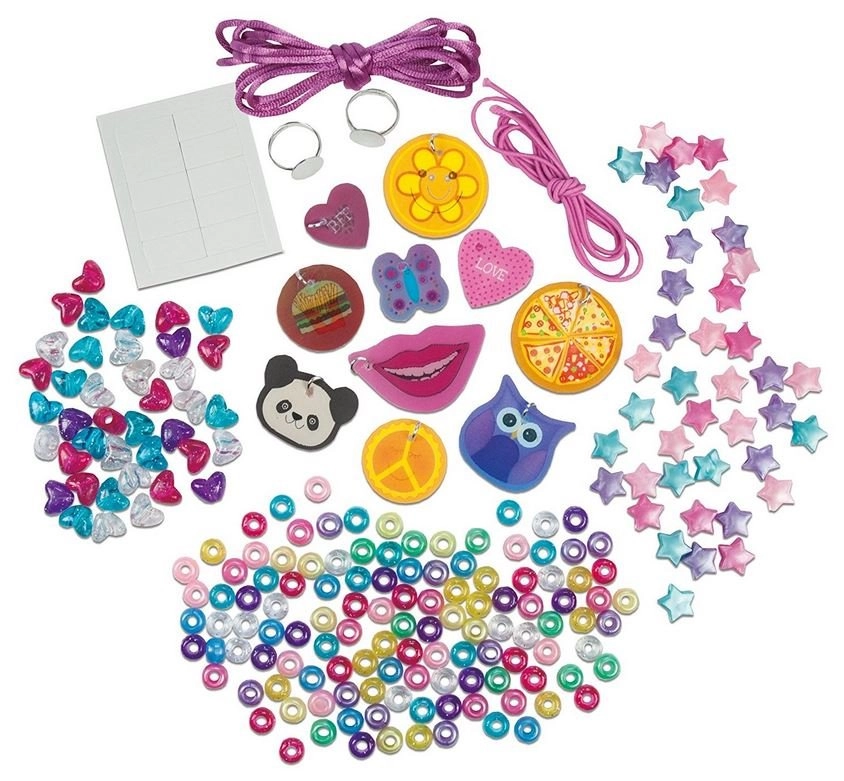 - 200 gyöngy (120 kerek, 40 szívecske, 40 csillag), 10 medál, zsinór, gumiszalag, 2 gyűrű, öntapadó négyzetek