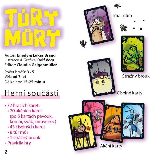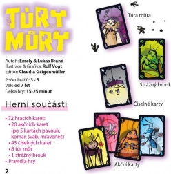 72 játékkártya: 20 akciókártya (5-5 pók, szúnyog, csótány, hangya), 43 számozott kártya, 8 túry múry kártya, 1 őrszem bogár, játékszabály