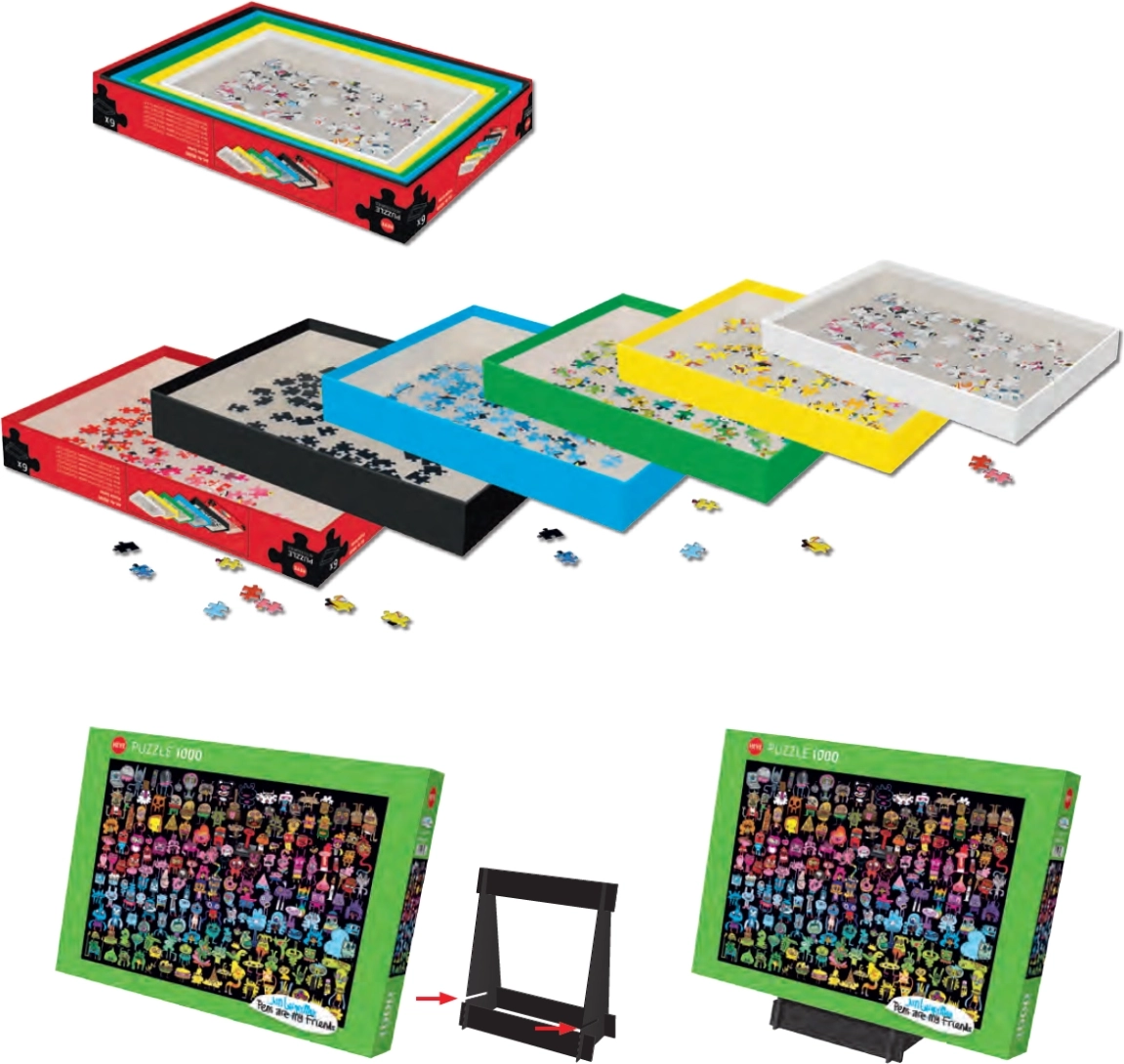 Ez az okos HEYE szett ideális minden puzzle-rajongónak, aki szereti a rendet és a kényelmet. A hat különböző színű és méretű doboz segít a darabokat színek, formák vagy motívumok szerint válogatni. Helytakarékosság céljából egyszerűen egymásba illeszthetők, ha nincsenek teljesen tele.