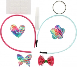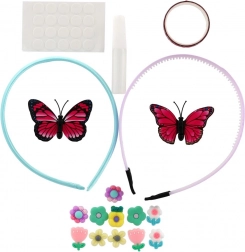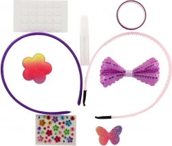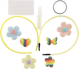- 2 műanyag fejpánt, dekorációk mixe (pillangó, szív, virág applikációk, kövecskék), öntapadós pöttyök, kis ragasztó; egyes szettek szalagot/zsinórt vagy karikát is tartalmazhatnak