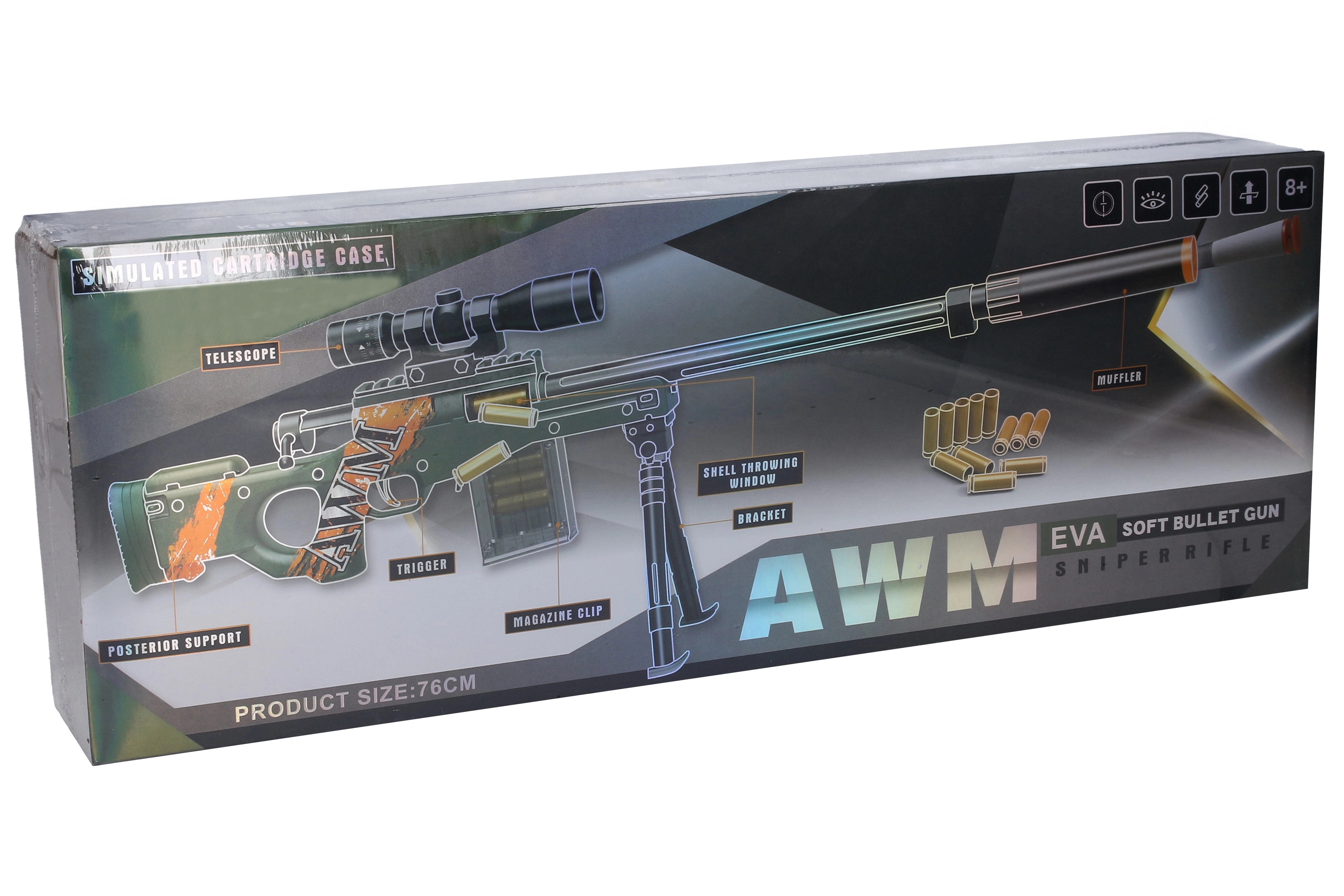 A valósághű, AWM modell által inspirált gyerekpuska örömöt szerez az akciójátékok kis rajongóinak. Szétszerelhető kialakítást, 76 cm-es hosszt, állványt, tompítót és irányzékot kínál a jobb célzásért. A csomag része 10 patron és 10 hablövedék. A doboz hátoldalán képes útmutató található az összeszereléshez és használathoz.