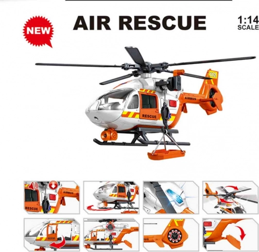 A gyerekek értékelni fogják a nyitható oldalsó ajtókat és hátsó ajtólapot, a mozgatható kampót szállító kosárral, valamint a összecsukható és forgatható rotorokat. Az elöl, felül és a pilótafülkében található LED világítás a hiteles repülési és riasztó hangokkal együtt fokozza a mentőakciók hangulatát. A helikoptert 2× AAA elem működteti (a csomagban).