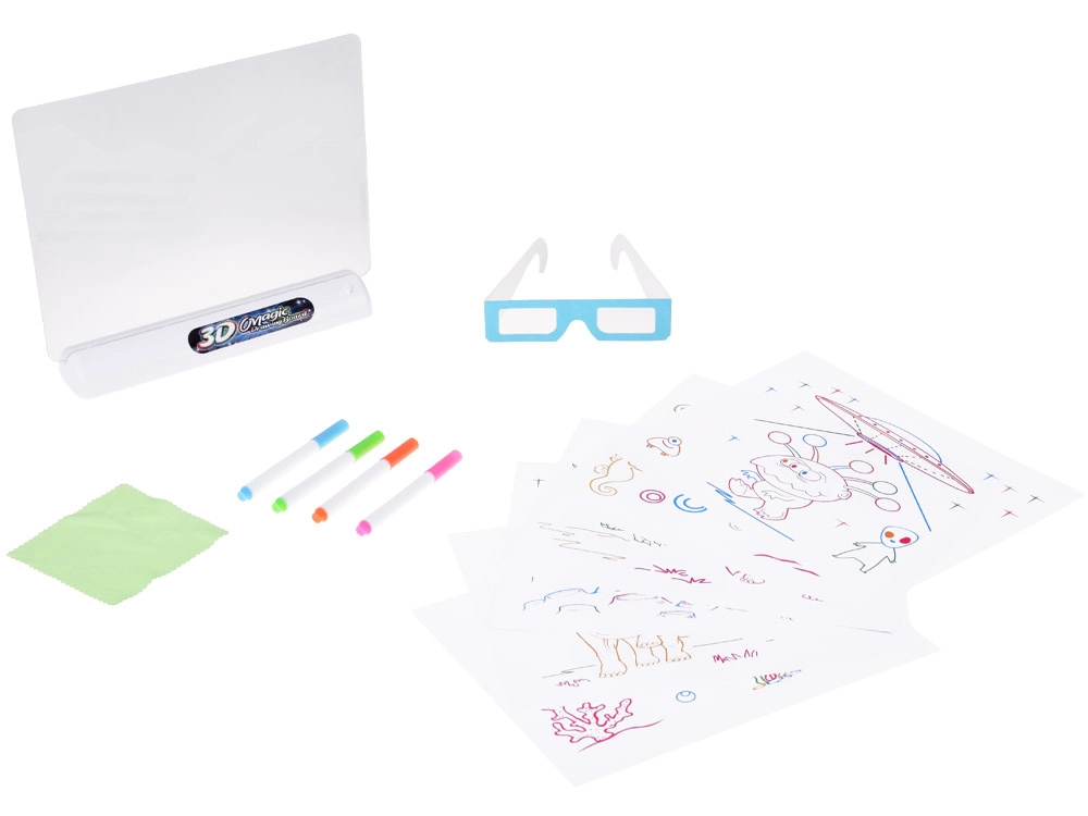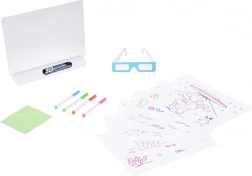 Az átlátszó lap LED háttérfénye életre kelti a filctoll-vonásokat. A 3D szemüveg felvétele után a képek valósághű térhatást és wow effektust kapnak.