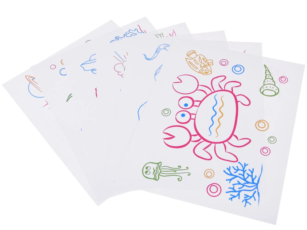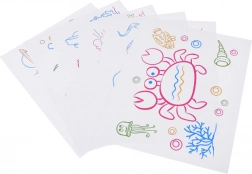 A csomagban kétoldalas sablonok találhatók tengeri motívumokkal. A gyerekek a panel mögé helyezhetik és kényelmesen átrajzolhatják az első képeket.