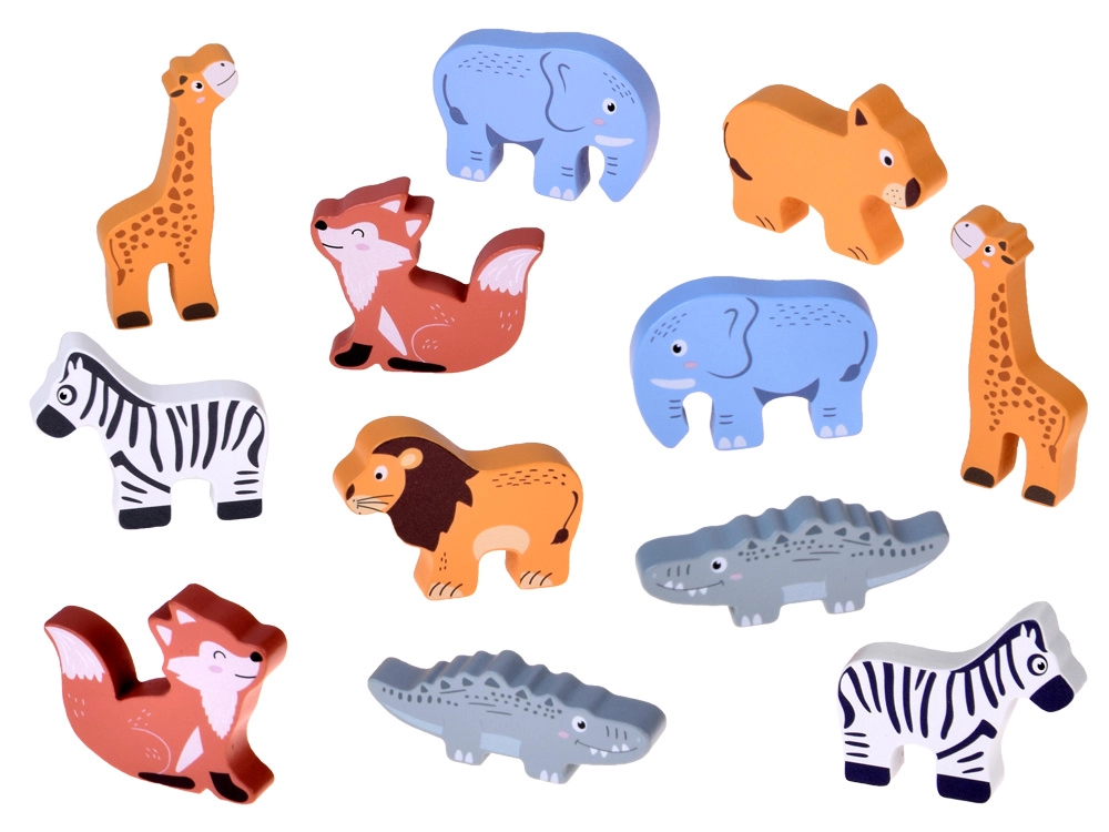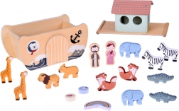 A szett páros állatfigurákat tartalmaz (elefántok, zebrák, zsiráfok, oroszlánok, rókák, krokodilok, madarak) és két figurát – Noét és feleségét. Ideális történetmeséléshez és az állatnevek tanulásához.