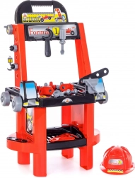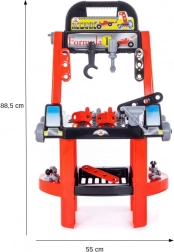 A kis ezermester készlet kompakt műhelyasztalt tartalmaz polccal a munkalap alatt és felső részén szerszámakasztó kampóval. Nem hiányzik a csavarhúzó, a franciakulcs, a csavarozható lapos elemek, a csavarok és anyák, a csavaralátétek, a satu és a védősisak sem. A csomag része egy matrica szett is a műhely vonzó megjelenéséhez.
