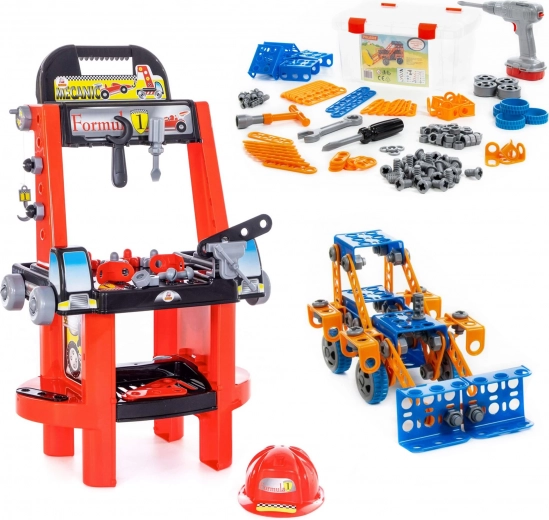 A Polesie márka komplett gyermekkészlete a kis ezermestereknek ötvözi a masszív munkapadot egy szerszámos kofferral és egy konstrukciós építőkészlettel, összesen 142 elemmel. A gyerekek élvezhetik a gazdag tartozékokat, a praktikus tárolási megoldásokat, a valósághű szerszámokat, valamint megépíthetik a szélkereket, malmot vagy járműveket. Ideális a finommotorika, a kreativitás és a logikus gondolkodás fejlesztéséhez 3 éves kortól.