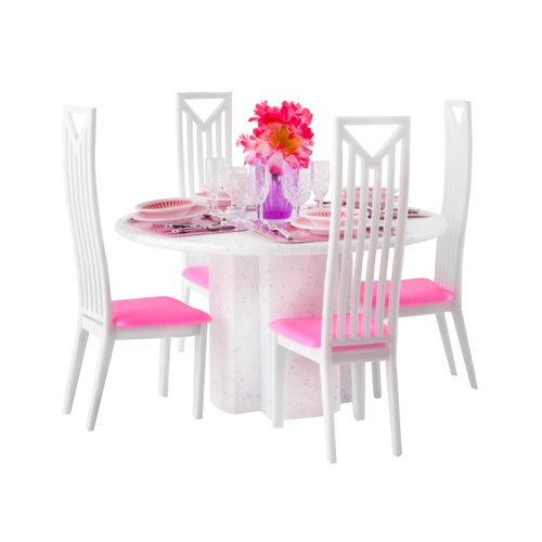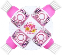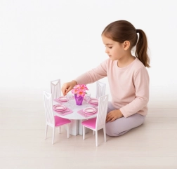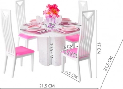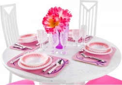 Kerek asztal, négy szék és teljes edény- és evőkészlet. Minden rózsaszín–fehérben összehangolva a valósághű terítéshez és mutatós megjelenéshez.