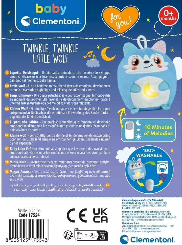 Az interaktív Twinkle Twinkle plüss farkas remek társ a nyugodt alváshoz és a játékos stimulációhoz. A lágy fény és a gyengéd dallamok támogatják a hallási és vizuális észlelést, míg a selymes felület fejleszti a tapintást és biztonságérzetet nyújt. Minőségi kivitelezésének és tanúsított anyagainak köszönhetően a játék már az első napoktól alkalmas a babák számára.