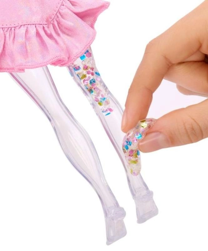 Helyezd a slime-ot a baba átlátszó lábaiba, és élvezd a csillogó hatást. A csere egyszerű és többször megismételhető.