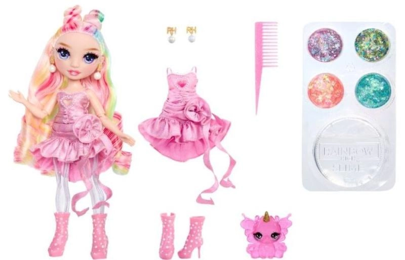 A Rainbow High Bella baba új játékélményt nyújt: kombináld a slime-ot és a csillámokat, alakítsd a megjelenést, és hozz létre csillogó effektusokat a baba átlátszó lábaiban. A hosszú, sokszínű hajnak, a rózsaszín szettnek és a kiegészítőknek köszönhetően rengeteg divatos és kreatív jelenetet élhetsz át.