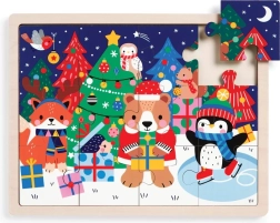 A MUDPUppy gyermek fa kirakó varázslatos ünnepi hangulatot hoz vidám állatfigurákkal, ajándékokkal és feldíszített fácskákkal. A nagy, kellemesen „pufók” darabokat a kis kezek könnyen megfogják, és közvetlenül a strapabíró fa tálcába illeszkednek, így egyetlen darab sem vész el.