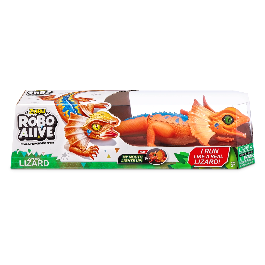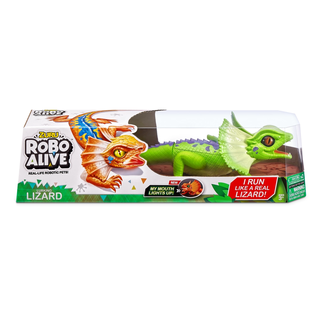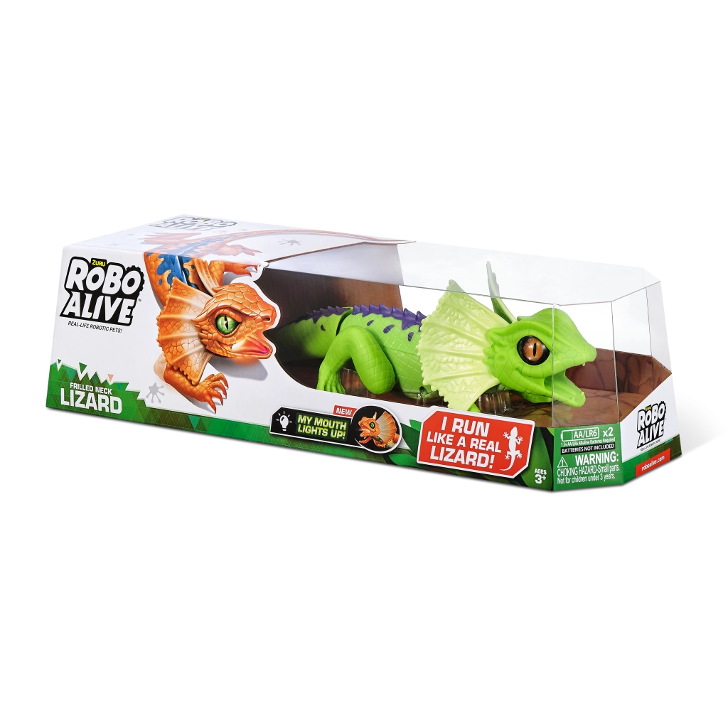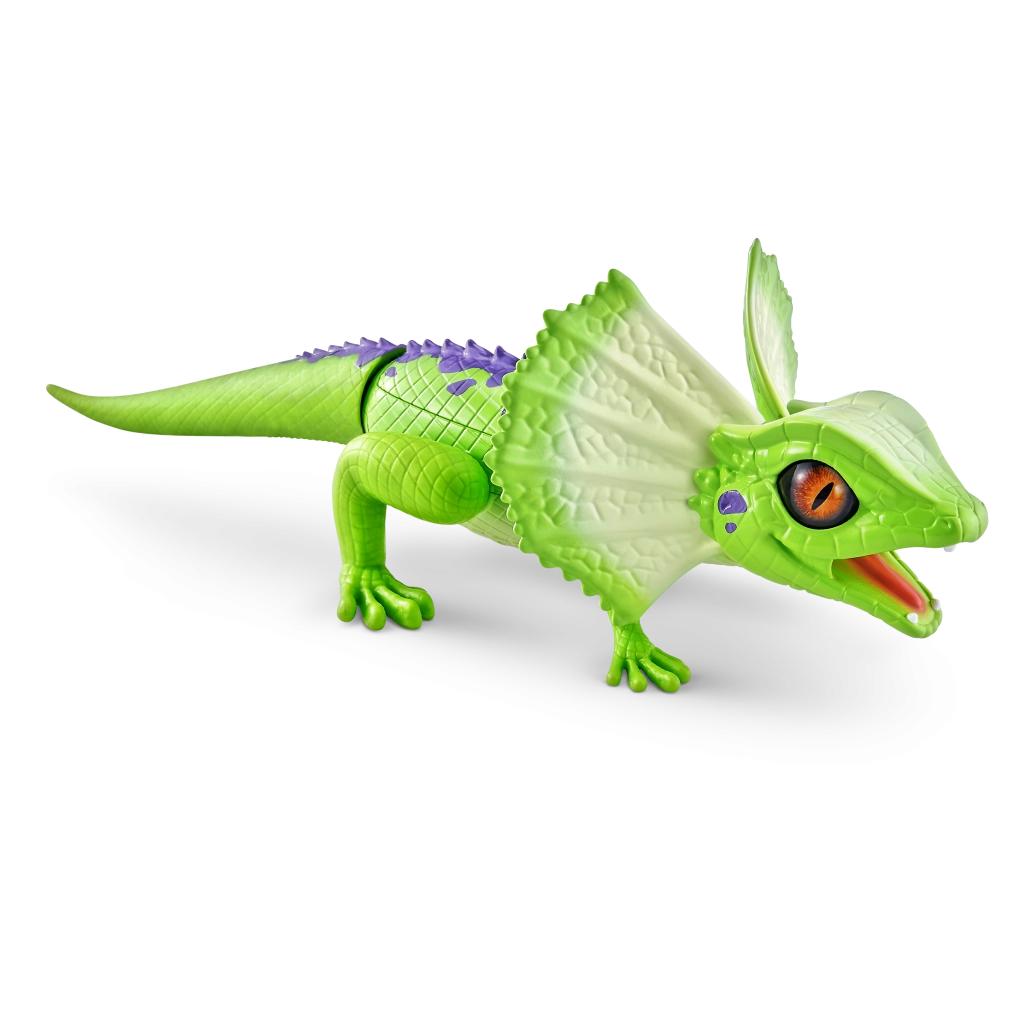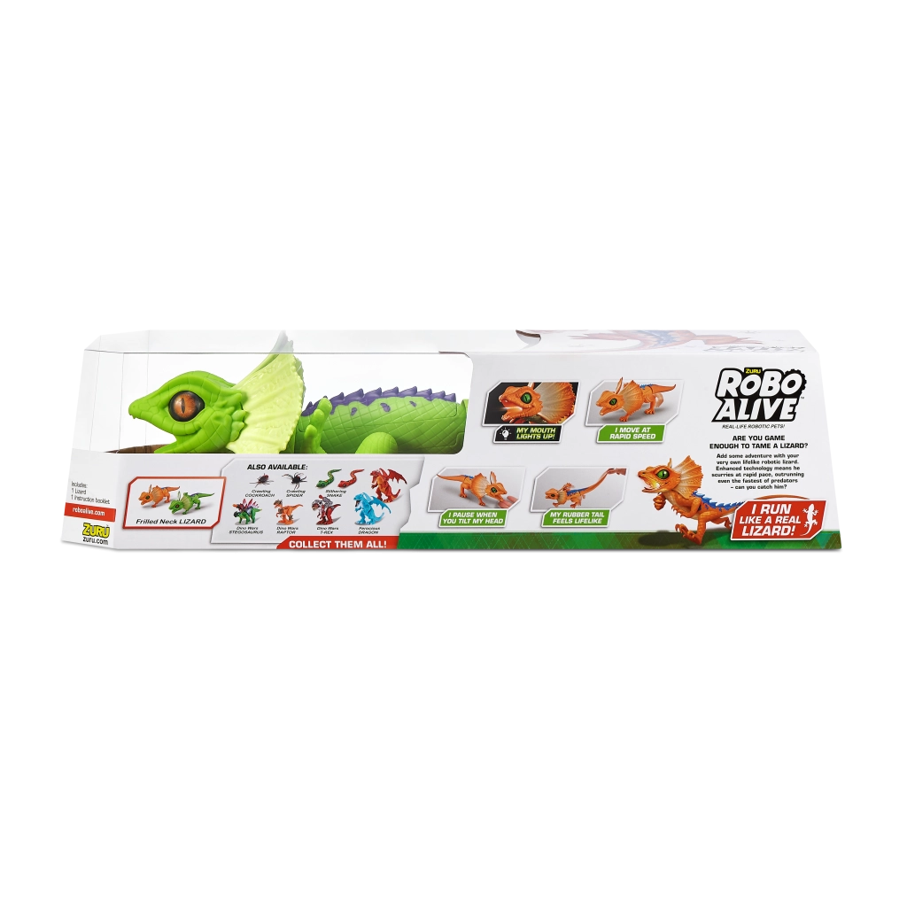 A ROBO ALIVE robotgyík mozgással teli, akciódús játékot kínál a gyerekeknek. Motoros meghajtásának és átgondolt felépítésének köszönhetően képes a gyors futásra, a sima fejforgatásra és a stabil léptekre. A valósághű pikkelytextúra, a nyakfodor (frill) és az élénk színek autentikus megjelenést adnak a játéknak.
