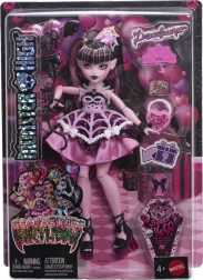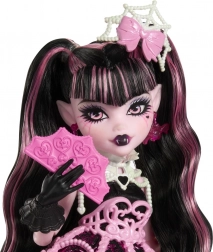 Feltűnő goth-glam megjelenés, csillogó részletek és a Monster High világának jellegzetes motívumai.