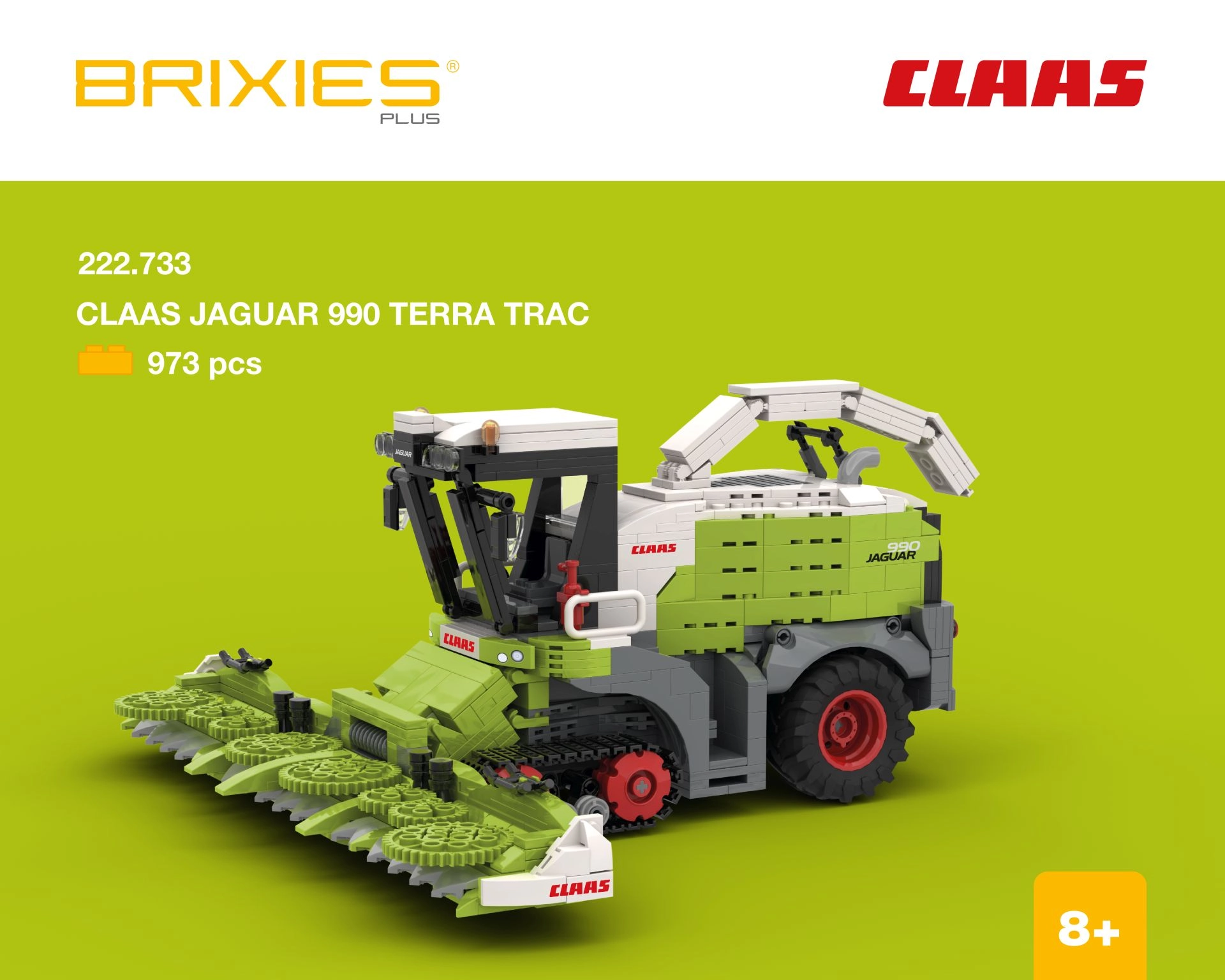Ez az építőkészlet a CLAAS JAGUAR 990 TERRA TRAC lánctalpas silózó realista modelljét kínálja. Összeépítve megközelítőleg 31,4 × 15,4 × 32,7 cm (h × m × sz) méretű. A BRIXIES Plus nagyobb kockái kényelmes építést biztosítanak, és kompatibilisek más, hasonló típusú építőkészletekkel. A csomagban részletes útmutató is található.