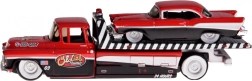 A CHEVROLET Flatbed 1957 vontató részletes szállítórámpával rendelkezik, amely hűen idézi a klasszikus autók valós szállítását.