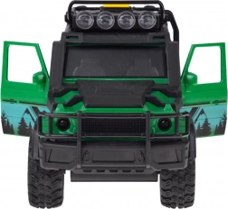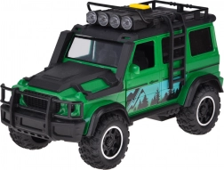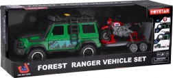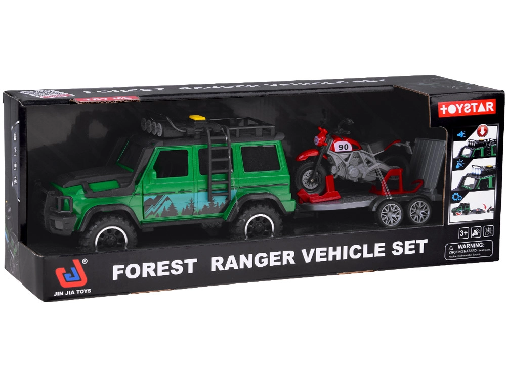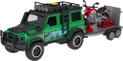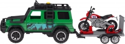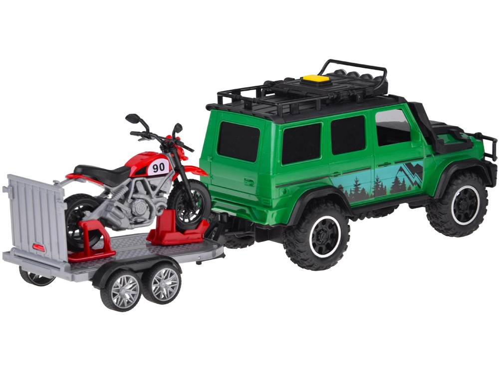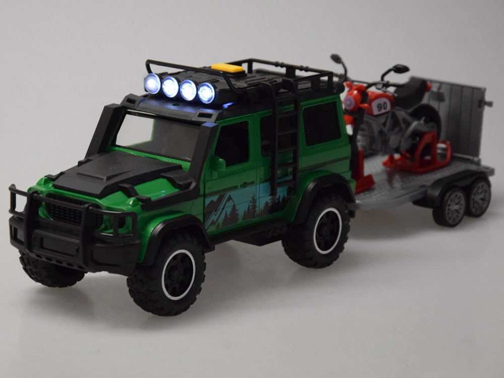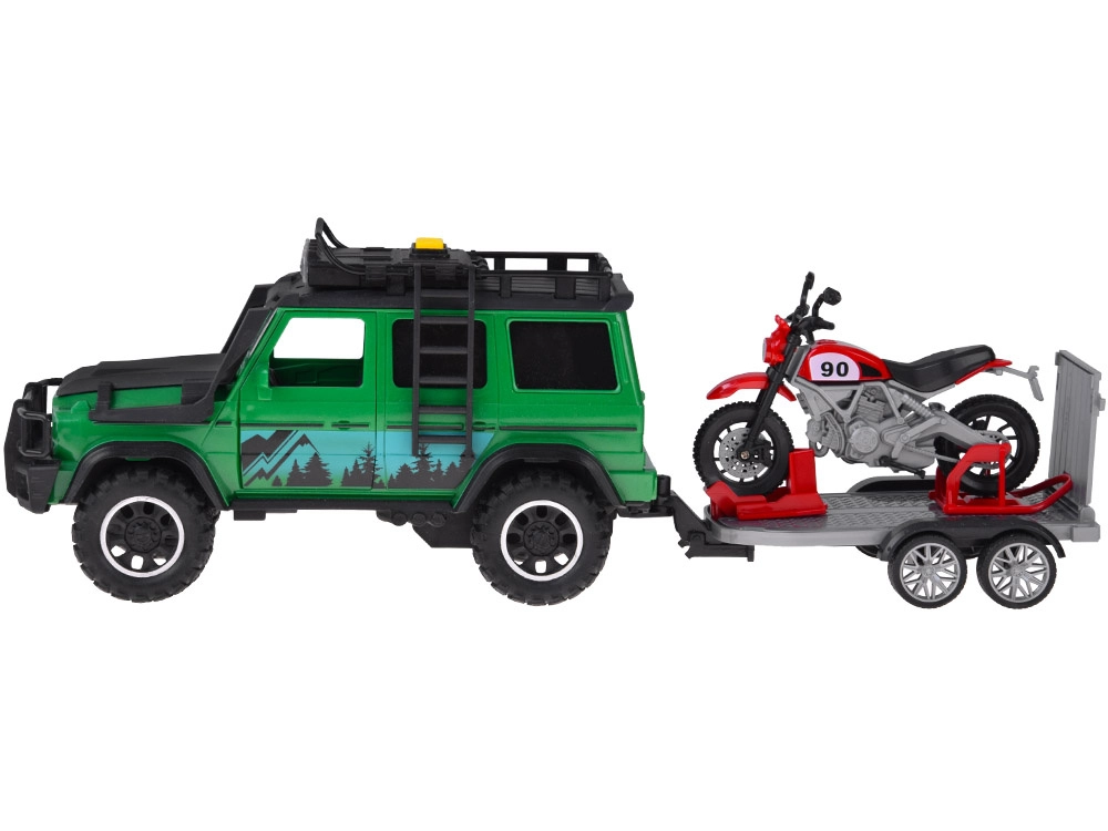 Kalandos készlet kis sofőröknek: zöld terepjáró levehető platós utánfutóval és piros sportmotorral. Az autó fény- és hangeffekteket, nyitható ajtókat és gumírozott kerekeket kínál az egyenletes haladáshoz. Az utánfutón lehajtható hátsó rámpa van a motor könnyű fel- és lerakodásához, valamint biztonságos szállításához. Ideális kreatív játékhoz és más kedvenc játékok szállításához.