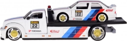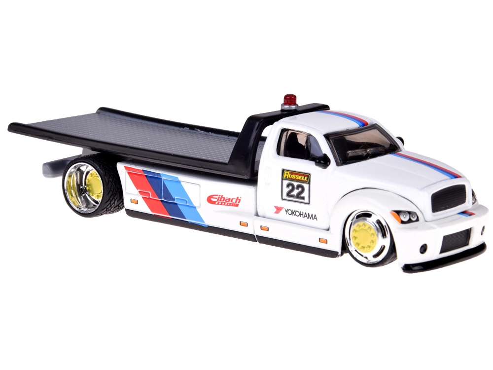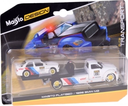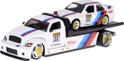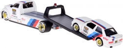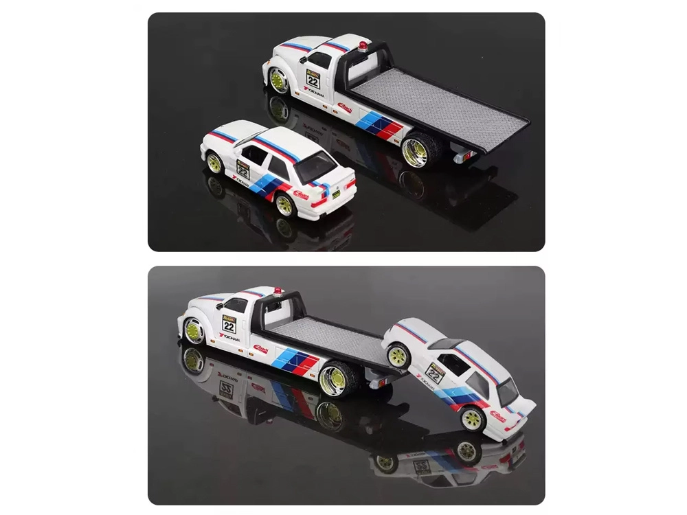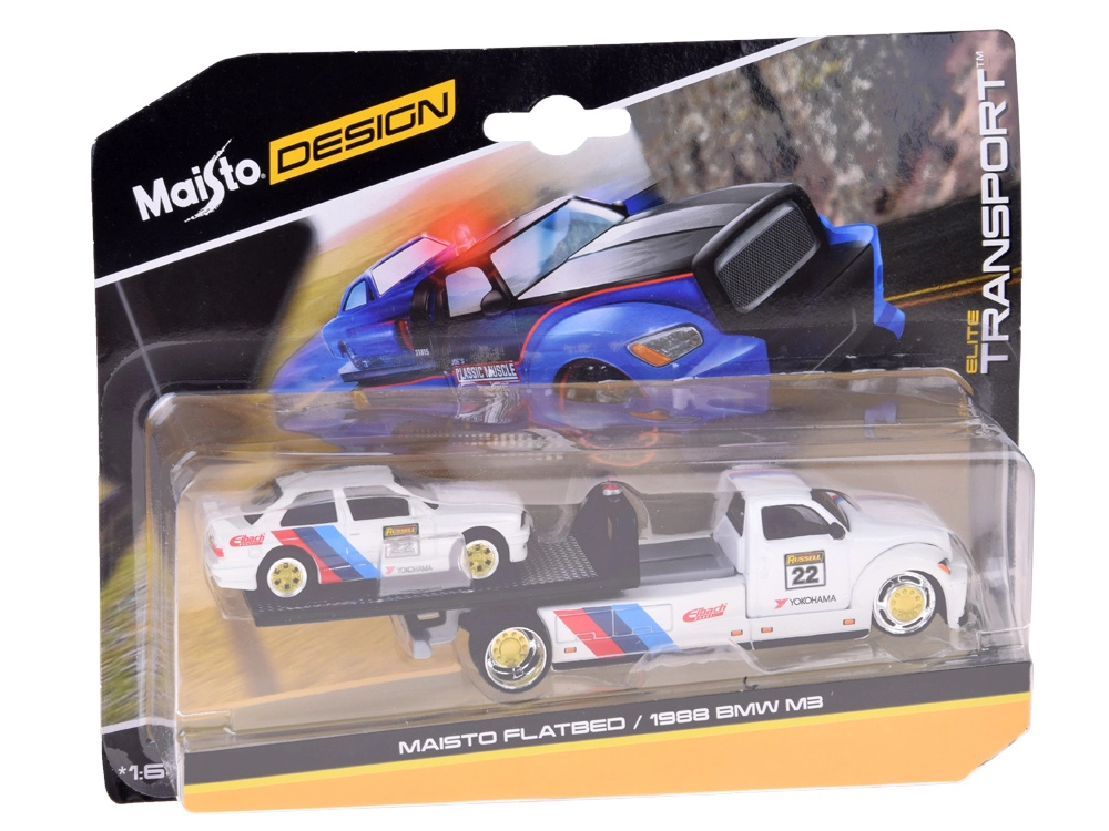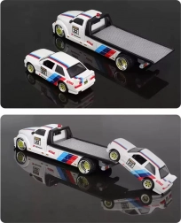 Ez a licencelt die-cast készlet 1:64 méretarányban egy felhajtó rámpás vontató teherautót és a kultikus BMW M3 1988-at egyesíti. Az egységes fehér szín versenycsíkokkal, rajtszámokkal és szponzorlogókkal kiemeli a sportos karaktert, és vonzóvá teszi polcon és játék közben egyaránt.