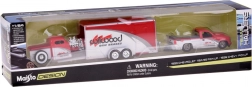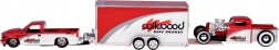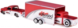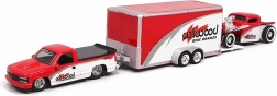 Stílusos gyűjtői szett 1:64 méretarányban, benne az ikonikus CHEVROLET 454 SS Pick-up 1993 és a klasszikus CHEVROLET Pick-up 1936 szállítópótkocsin. A piros-fehér kivitelű modellek fém karosszériával, gumírozott kerekekkel a sima futásért és részletes tamponnyomással készülnek. A 454 SS pick-up levehető vonóhoroggal rendelkezik, a pótkocsi könnyen csatlakoztatható és leválasztható – ideális játékhoz és vitrinkiállításhoz is.