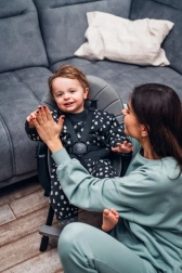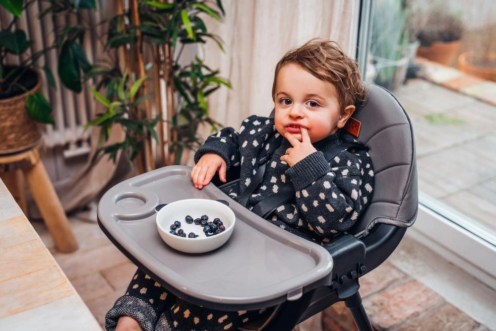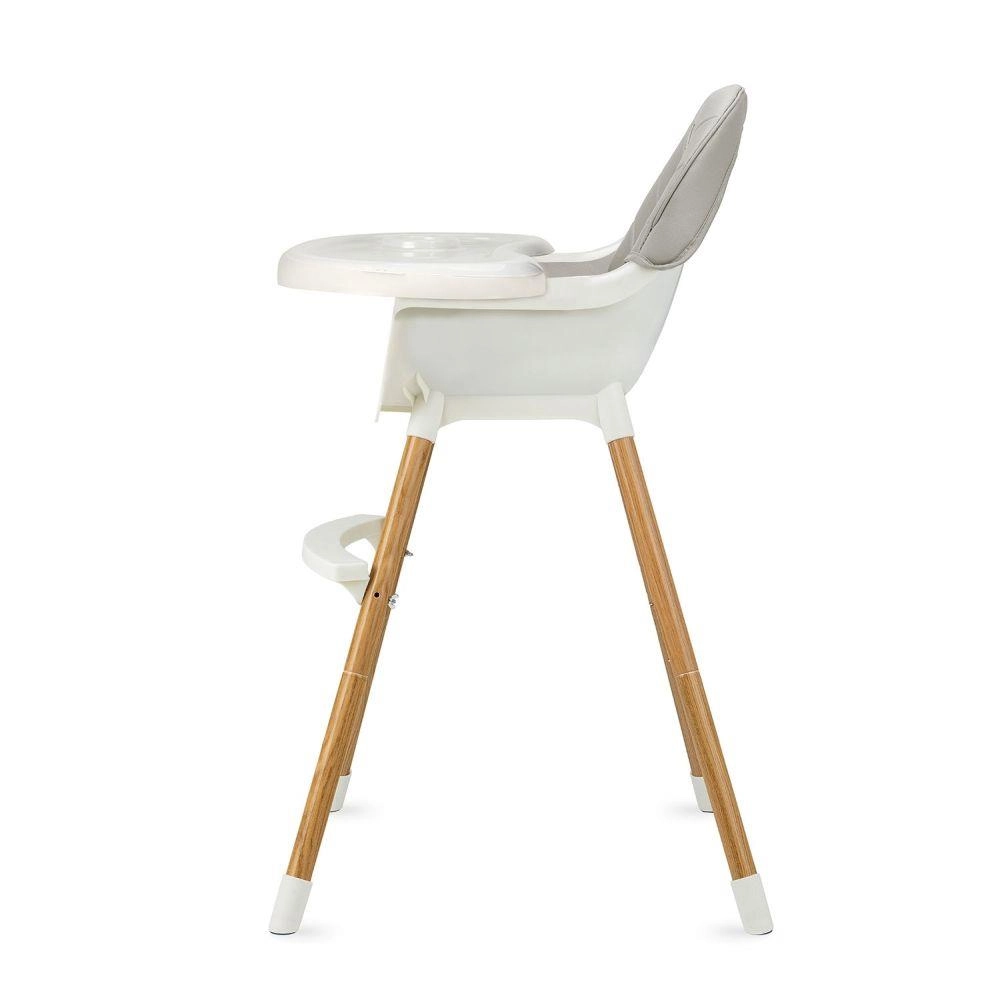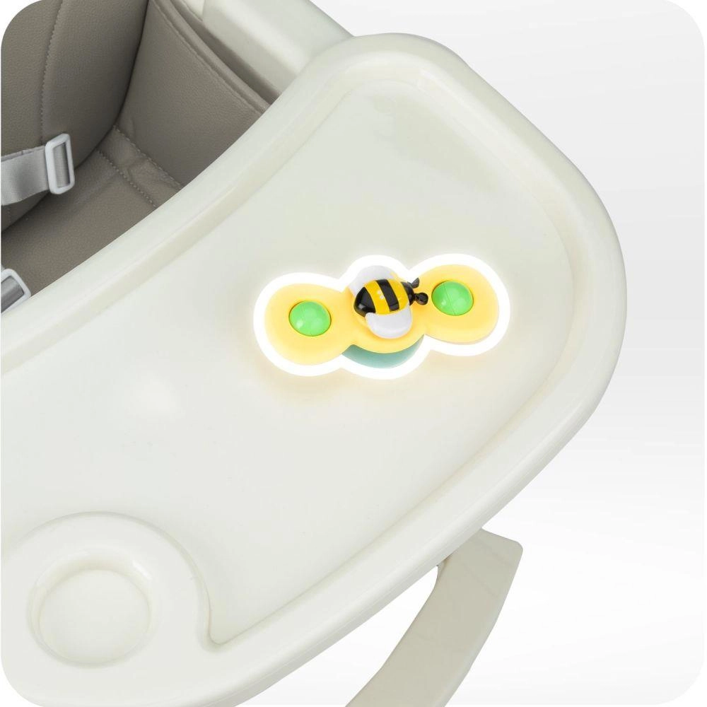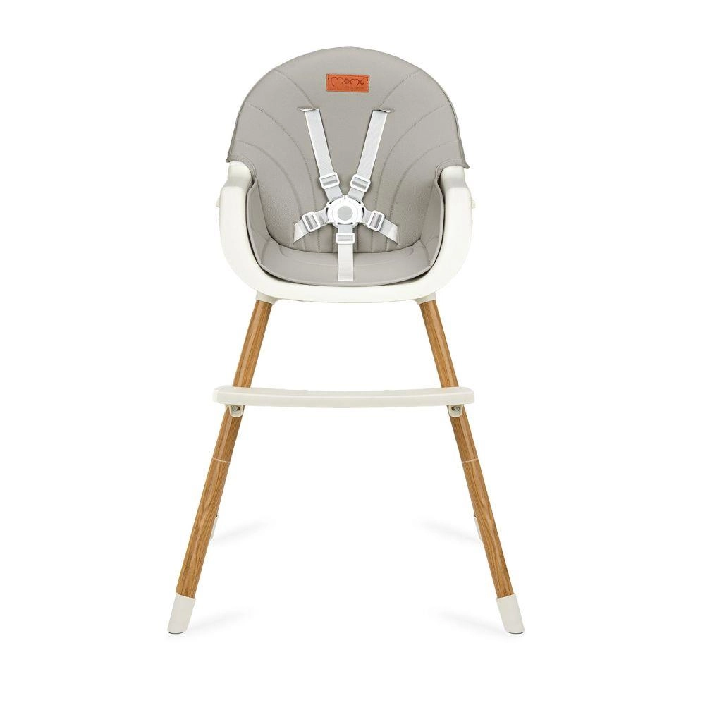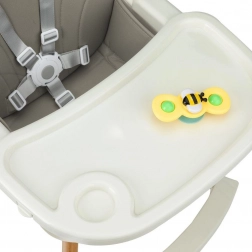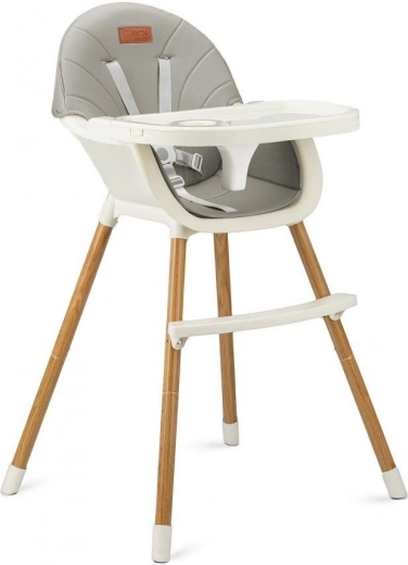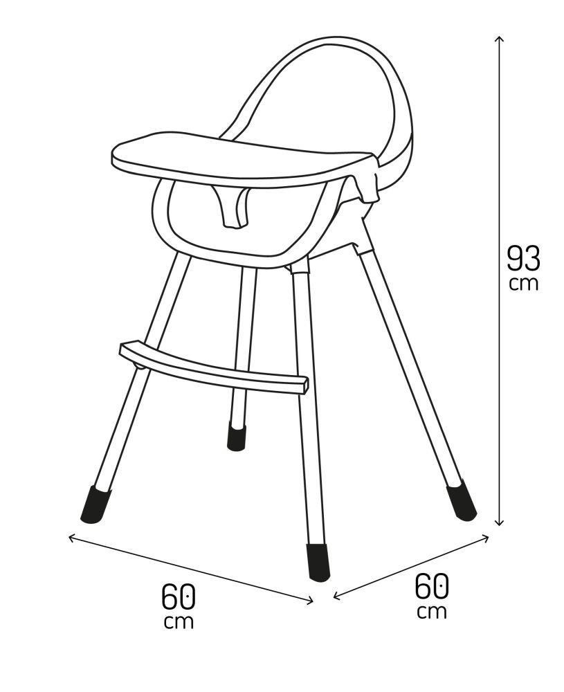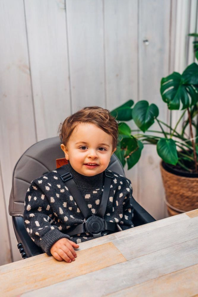 A praktikus részletek megkönnyítik a mindennapi használatot: az ökobőr gyorsan letörölhető, a tálca felső része mosogatógépben mosható, az állítható tálca pedig a gyermekhez igazítható. A stabil szerkezet lábtartóval és biztonsági övekkel kényelmes és biztonságos ülést nyújt.